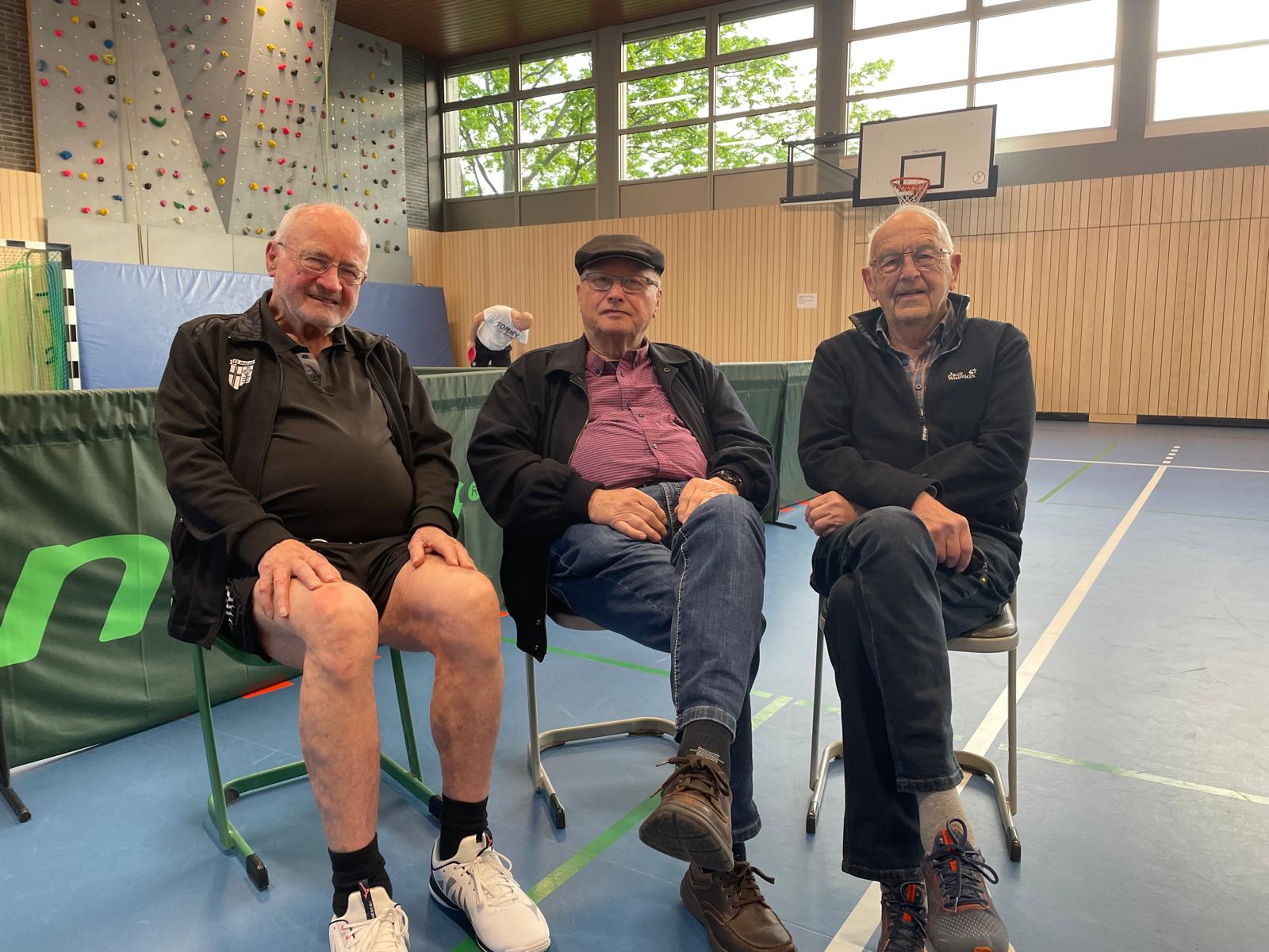 Tischtennis hat keine Altersgrenze! Das Bild zeigt die jahrzehntelangen und derzeit ältesten Mitglieder unserer Tischtennisabteilung, die auch heute noch an der Platte stehen: Hansjörg Fleiter (links), Jürgen Lenz (Mitte) und Klaus Helmerich (rechts).